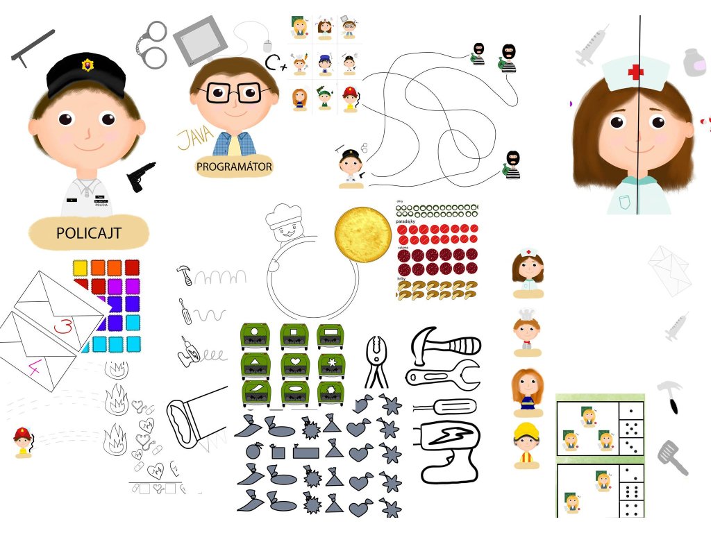 Jednou z najzábavnejších tém v materskej škole ale aj v detskej izbe. Veď koho by nelákalo hrať sa na hasičov,policajtov alebo doktorov? Pracovné listy plné zábavných aktivít na precvičenie Grafomotoriky,jemnej motoriky,logického myslenia a vizuomotoriky. Učenie hrou je samozrejme najlepším spôsobom ako utvrdiť v deťoch dôležitosť každého povolania. Či už je to na vychádzke kde deti pozorujú práce na cestách, alebo stretnú smetiarov či počas ranných hier pečú v kuchynke ako tí najlepší kuchári. S témou Povolania sa dá veru vyhrať! Pomôžu vám v tom aj tieto Pracovné listy. Vlastnoručne digitálne maľované takže jedinečnosť zaručená. Vlastná tvorba. Vhodné pre deti vo veku od 4 do 6 rokov